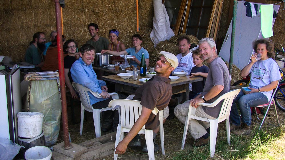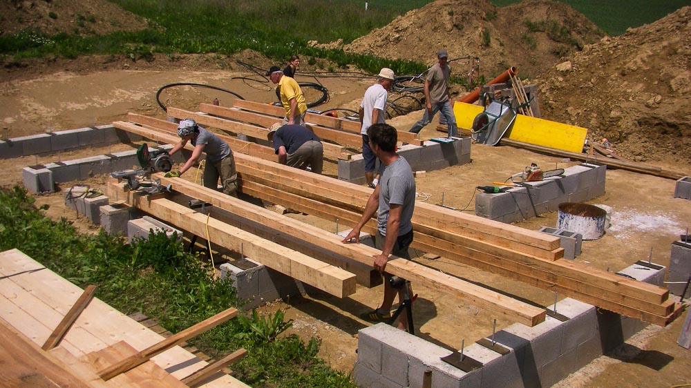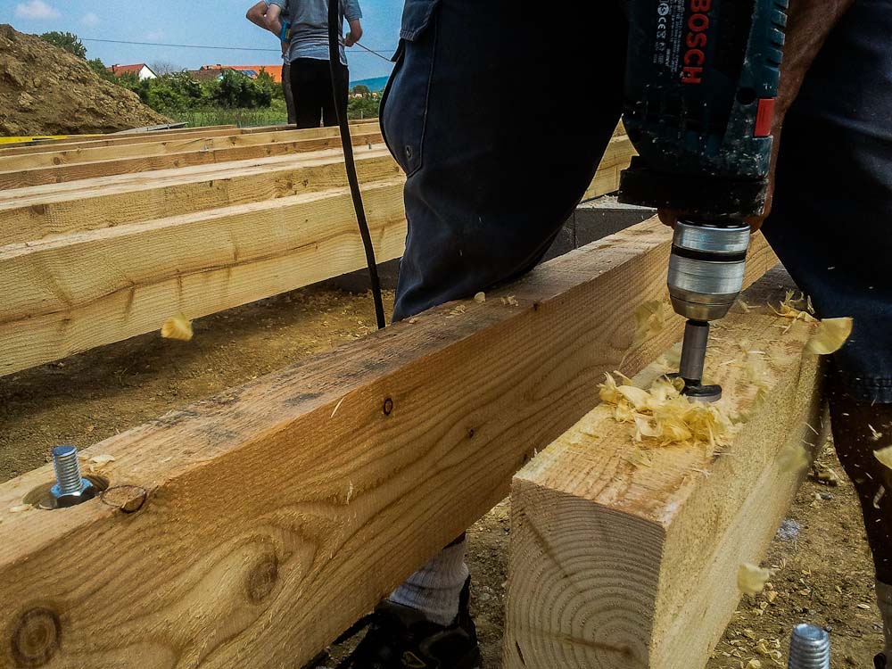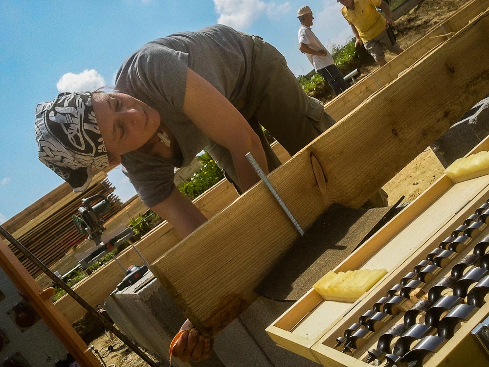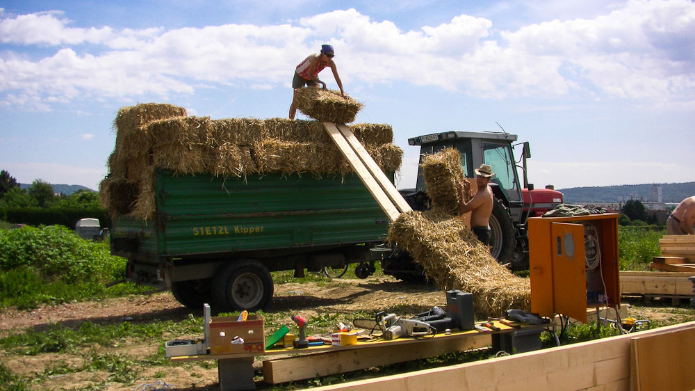 Als Unterkonstruktion für die Bodenplatte verwendeten wir Lärchneträme (8 x 16 cm) und darauf eine Unterdachplatte (16 mm). (Besser weil resistenter und dauerhafter wäre hier wohl eine zementgebundene Faserplatte. So ist das beim erfahrungsorientierten Lernen eben…) Darauf wurden 2 Lagen sägerauhe Pfosten (5 x 20 cm ) stehend montiert, wodurch die Strohballenboxen entstanden. Stroh hinein und OSB Platte drauf – fertig ist die Bodenplatte… Klar kann man hier statt der bösen OSB Platte auch Rauhschalung verwenden, doch gerade bei einer offenen Baustelle gilt es das Stroh in jedem Fall vor Feuchtigkeit zu schützen. Und das geht mit der Platte besser als mit den Brettern. (auch das durften wir im Zuge der Arbeiten lernen/spüren)