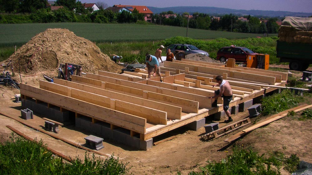 LEARNING: Unbedingt wichtig bei einer solchen Konstruktion ist eine gute Unterlüftung und noch viel mehr die Vermeidung des so genannten „Kellereffekts“. Dieser tritt im Sommer zu Tage, wenn warme, feuchte Luft auf die kühle Bodenplattenunterseite trifft und dort möglicherweise kondensierten kann. Vermeiden kann man eine Kondensation indem man das Erdreich unter der Bodenplatte schottert. Der Schotter kann von der durchströmenden warmen Sommerluft aufgewärmt werden, und somit kommt es zu keiner Kondensatbildung mehr.