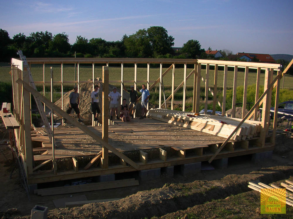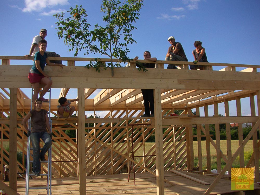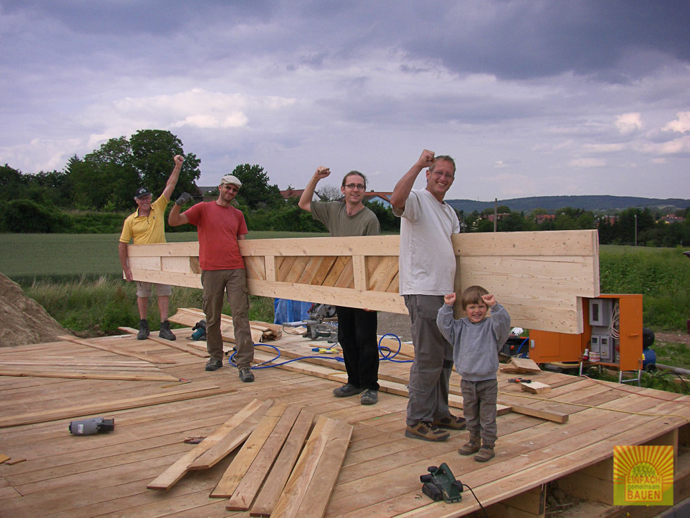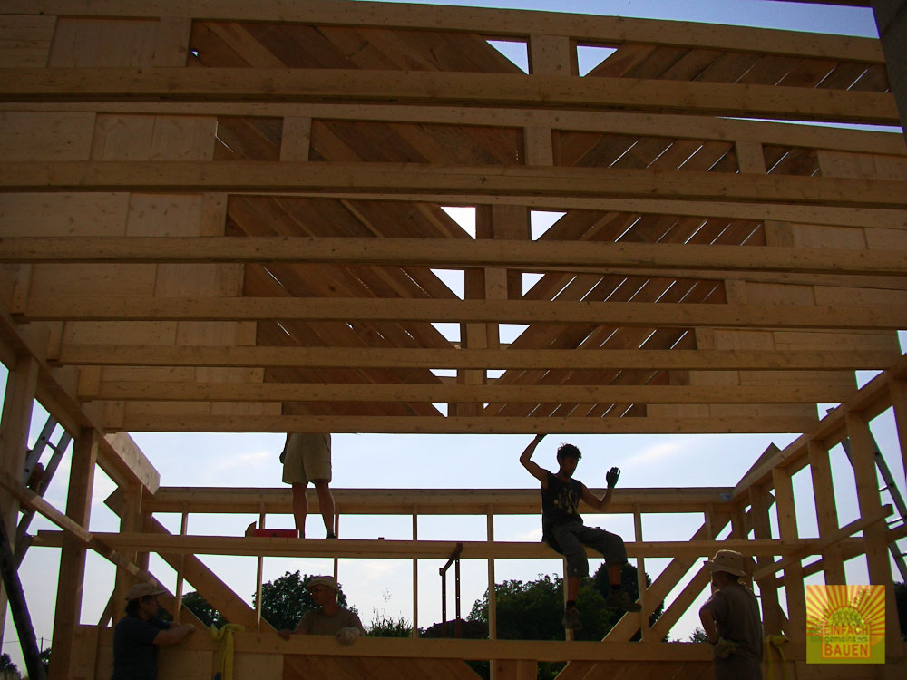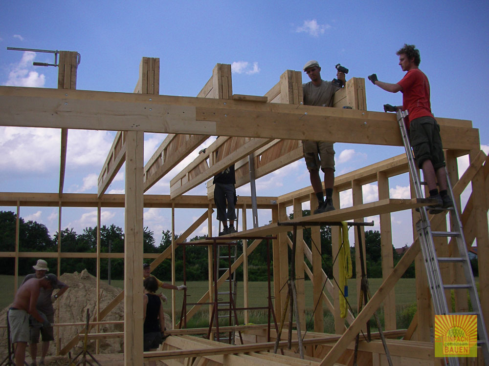 Außerdem überspannen wir die 6,5 m mittels selbstgebauter Nagelbinder – und die wollen dann auch empor gehoben werden; Schaut euch das an!
