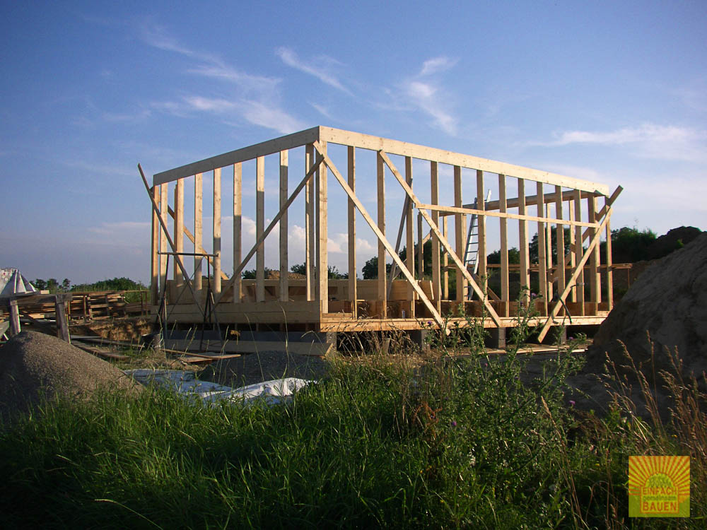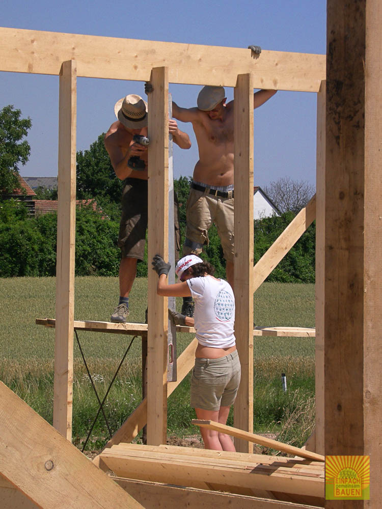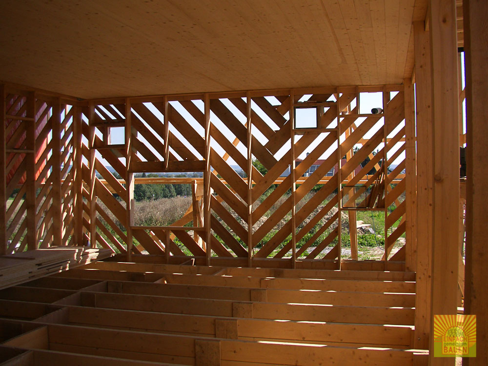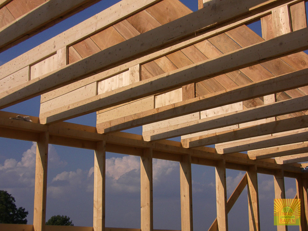 Wir bauen die Konstruktion aus relativ schmalen, sägerauhen Hölzern (4 x 18 cm) auf, wobei wir den Steherabstand dermaßen wählen, sodaß „exakt“ ein Kleinballen dazwischen Platz findet. Die Windaussteifung stellen wir mittels Diagonallattung bzw. Unterdachplatten her.