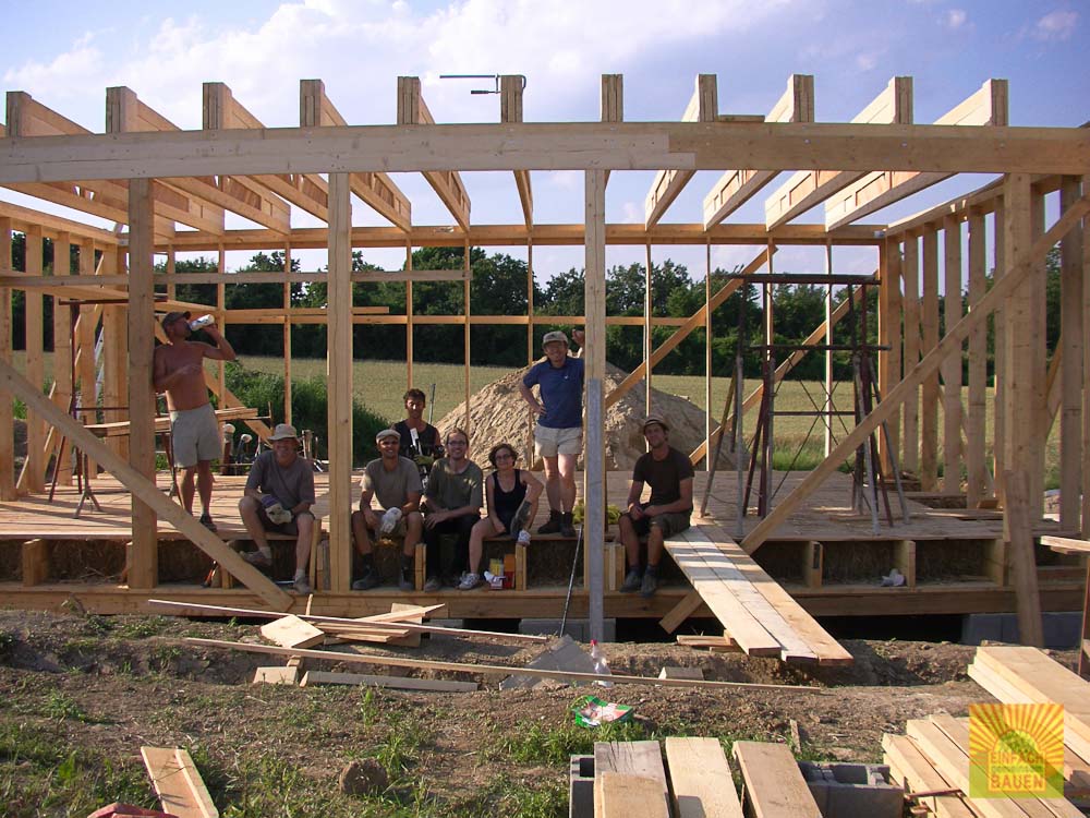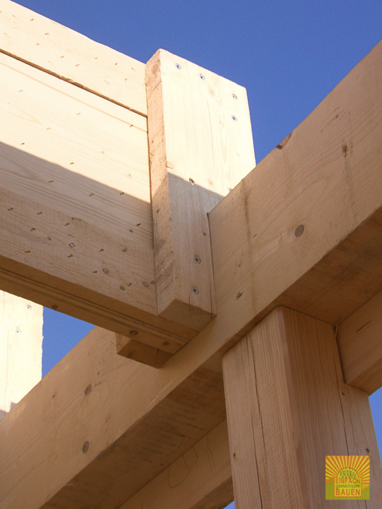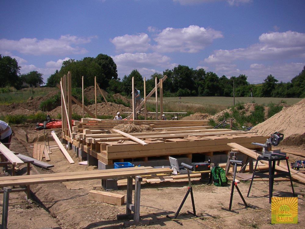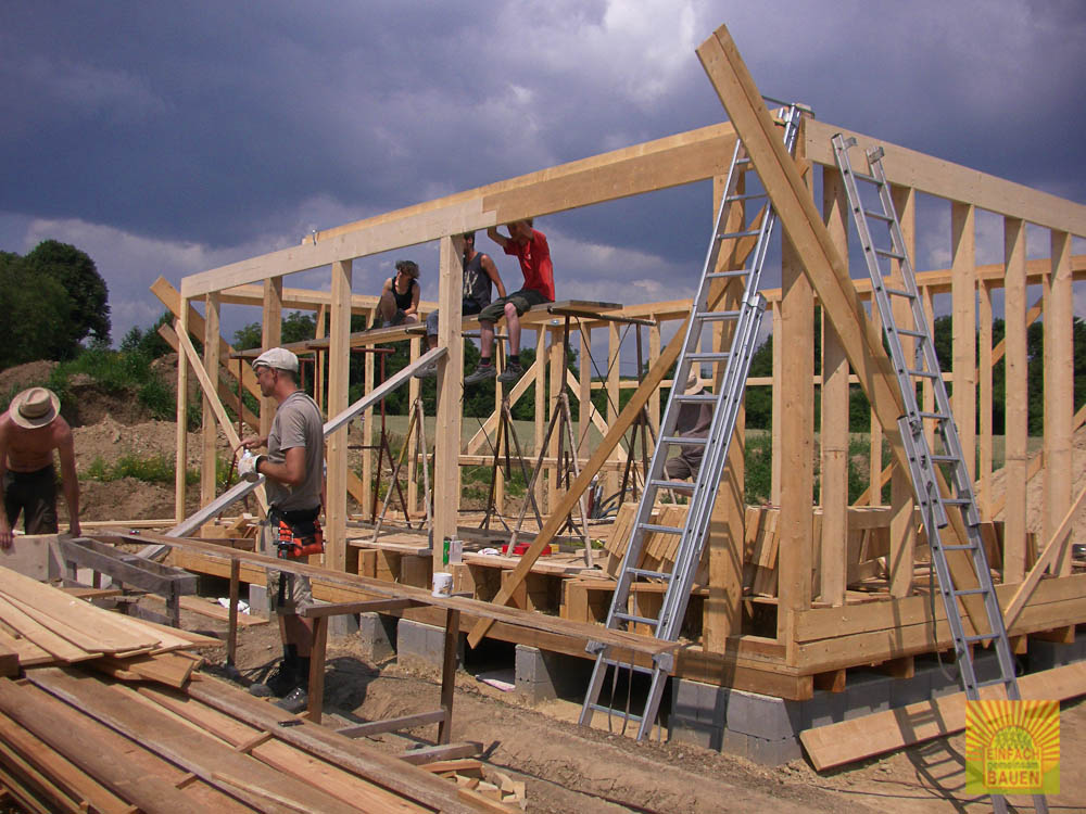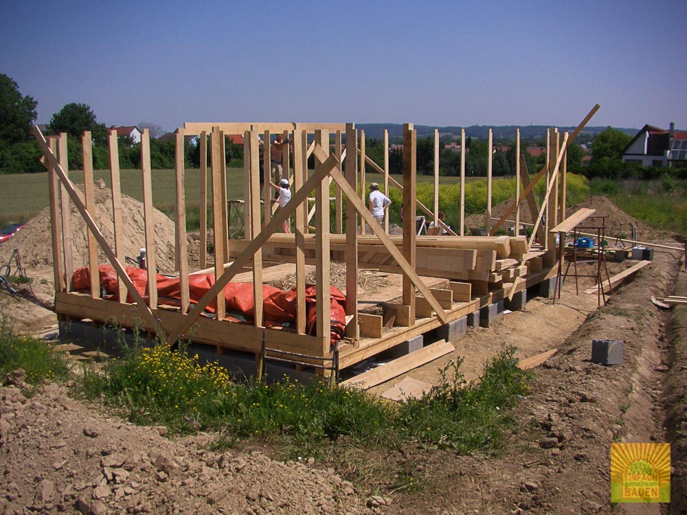 Wir bauen die Konstruktion aus relativ schmalen, sägerauhen Hölzern (4 x 18 cm) auf, wobei wir den Steherabstand dermaßen wählen, sodaß „exakt“ ein Kleinballen dazwischen Platz findet. Die Windaussteifung stellen wir mittels Diagonallattung bzw. Unterdachplatten her.